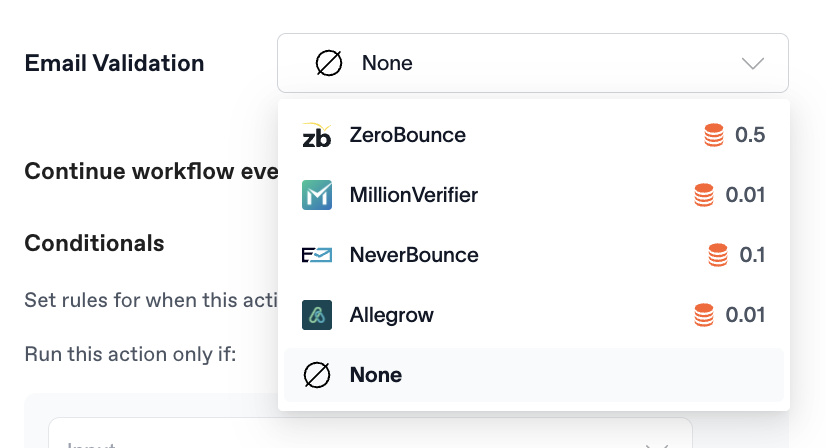 Insert email verification columns between enrichment steps to ensure quality before moving to more expensive providers. Available verification options include: