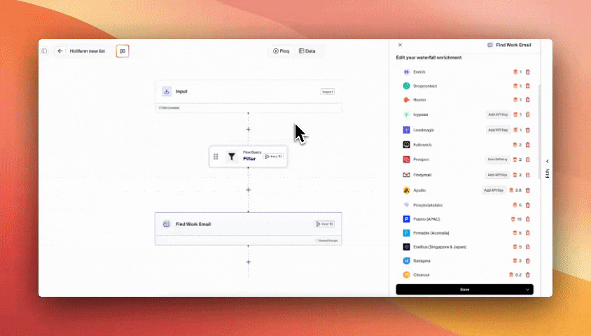 Floqer aggregates 80+ email enrichment providers in one platform, so you can build waterfalls using any combination of sources without managing multiple subscriptions. You can add your own APIs if needed too.
