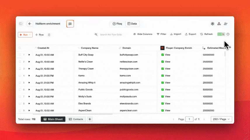 Upload a CSV, build a new list, or connect your CRM directly to Floqer. Your contacts appear as rows in a node graph view and spreadsheet-like interface.