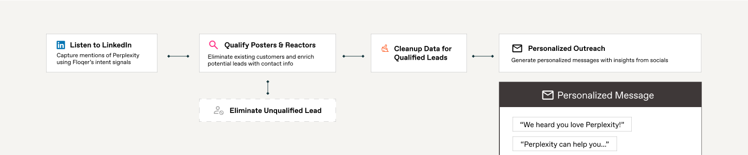 We saw there were over 10K mentions a day on LinkedIn for Perplexity — many of them were qualified enterprise leads looking to learn more about the product. Within hours, Justin setup a signal in Floqer to capture every LinkedIn mention using Floqer’s intent signal dashboard.