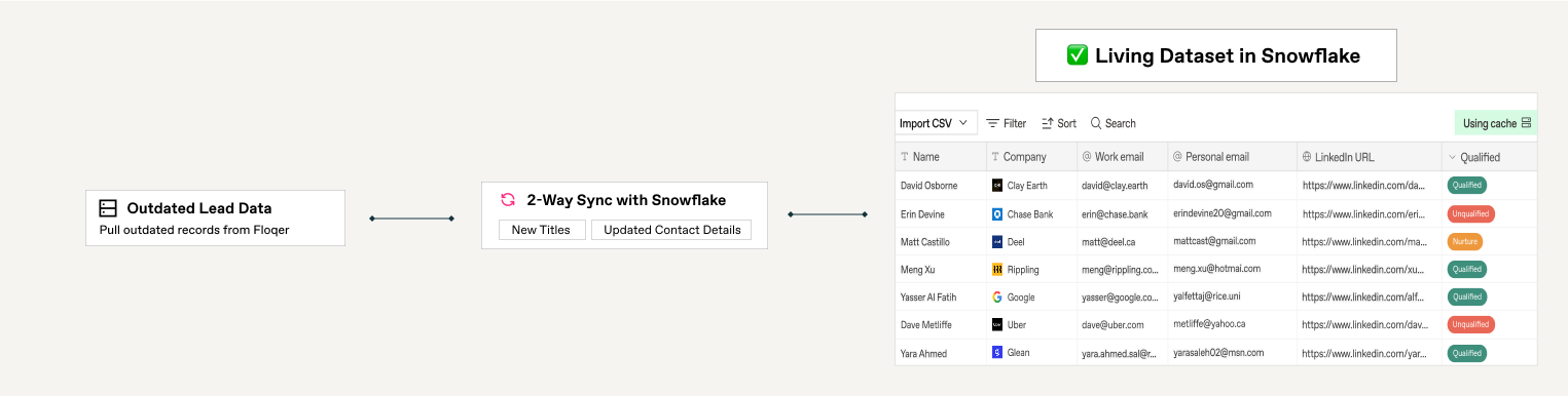 Floqer team helped Justin configure Snowflake 2-way sync — which auto imported the leads every month, refreshed their titles, contact details, and rerouted if any changes were detected.