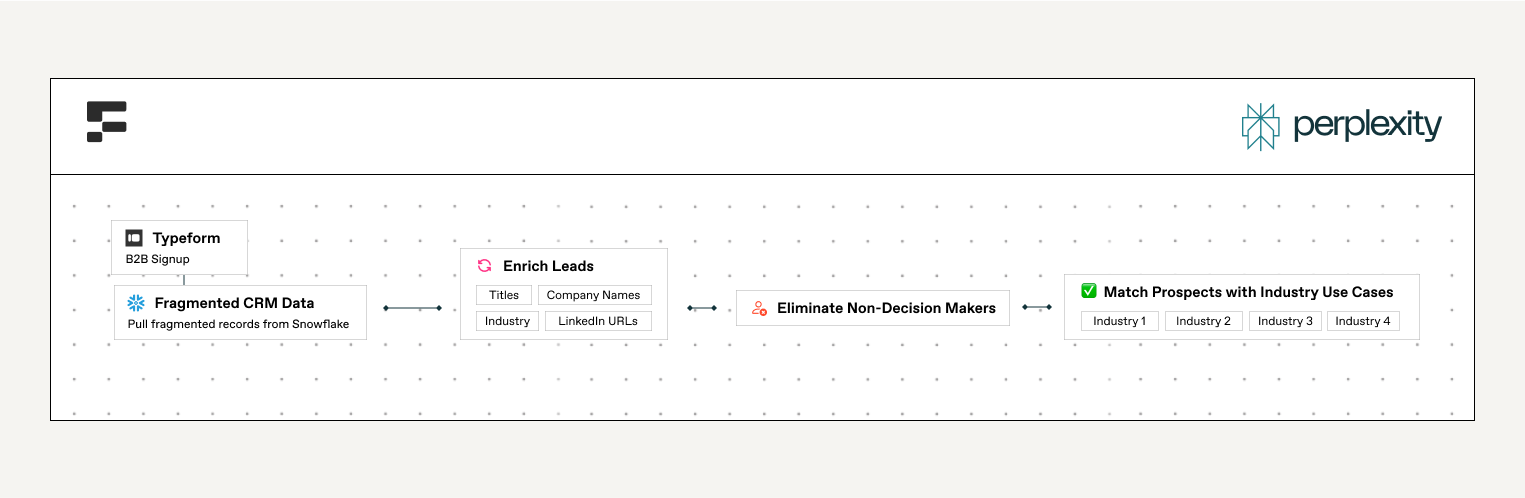 Justin tested countless other data enrichment tools, but after weeks of learning and setup, the coverage remained low. Perplexity was left with fragmented data in their Snowflake, and in many cases — just a personal or outdated email. They needed a better way to get more information on their user base and route high-fit enterprise prospects accurately in their CRM, so the email-only leads could turn into pipeline.